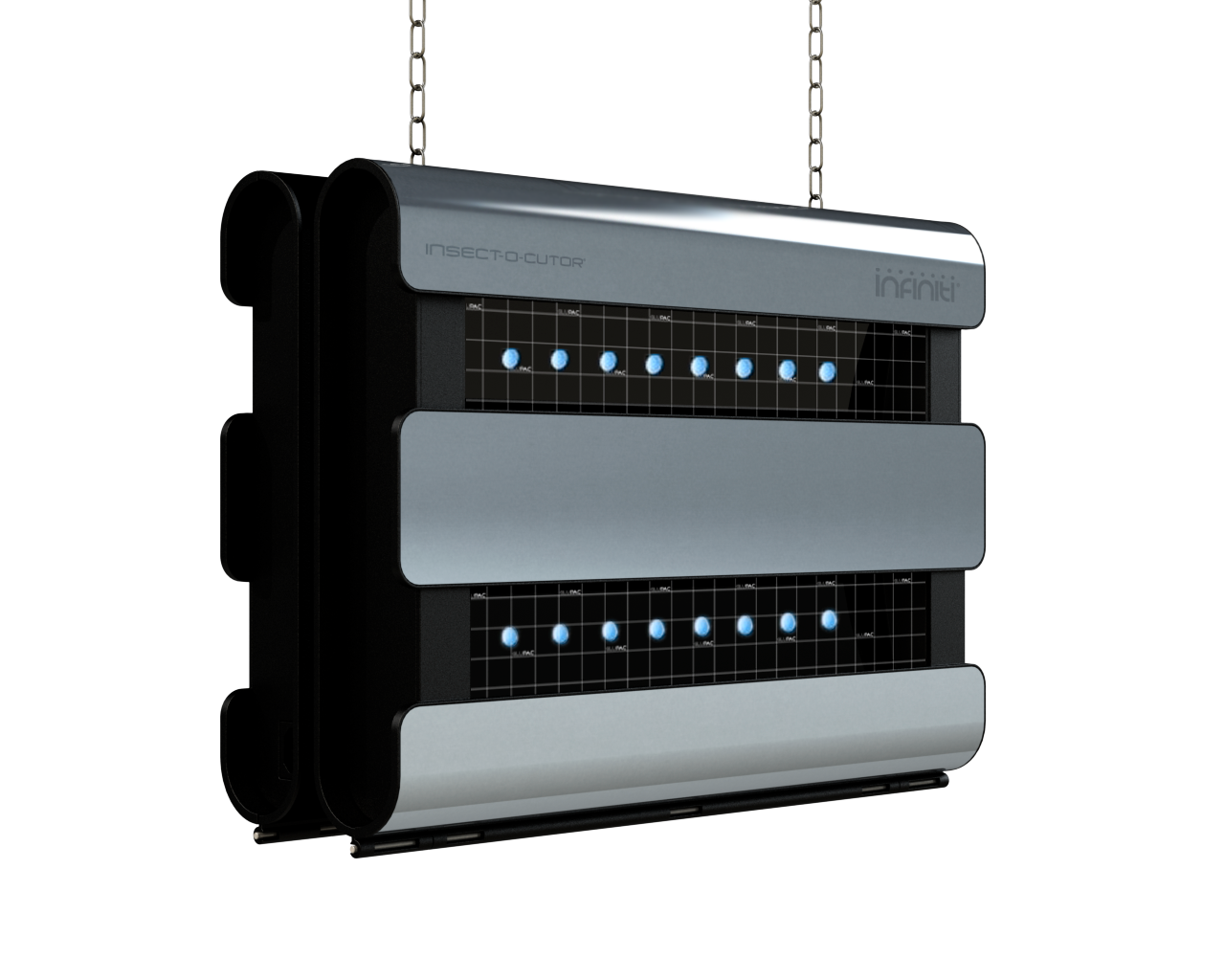 Insect-O-Cutor Infiniti® 4 – vliegenvanger voor grote professionele ruimtes De Insect-O-Cutor Infiniti® 4 is speciaal ontworpen voor gebruik in grote, open ruimtes zoals voedselproductie, horeca en magazijnen. Deze decoratieve en energiezuinige vliegenvanger combineert vier krachtige UV-LED-strips met een speciale Glupac®-lijmplaat, wat zorgt voor een unieke en uiterst effectieve insectenbestrijdingstechnologie. De Infiniti® 4 vliegenvanger heeft een bereik tot 240 m², biedt lage energiekosten, is eenvoudig in onderhoud en geschikt voor plafondmontage.